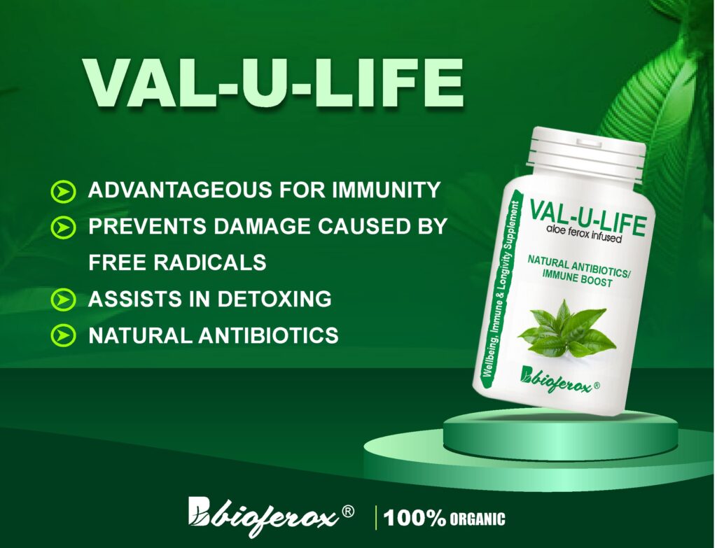 Val-u-Life capsules contain a blend of herbs formulated to support immune function and overall wellbeing. It is designed for individuals seeking long-term vitality and quality-of-life support as part of a healthy lifestyle.